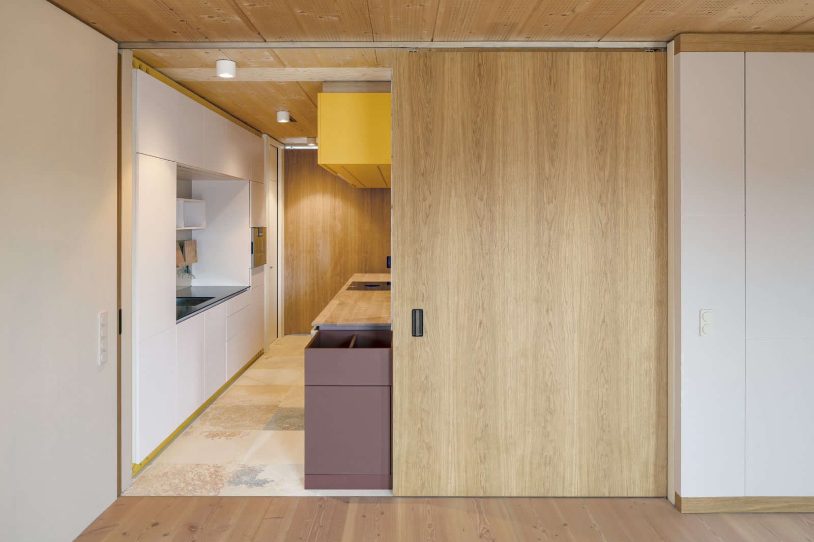 Vom mittig gelegenen Eingang aus hat man Blick auf die Küche, welche beide Wohnbereiche verbindet und so den zentralen Ort der Wohnung bildet. Diese Wohnbereiche richten sich zu den Außenfassaden mir einem jeweiligen Balkon und abgetrennten Schlafzimmer. Im mittleren Servicebereich befinden sich neben der Küche und dem Eingangsbereich auch noch die beiden Badezimmer. Für eine temporäre Zonierung kann der mittlere Teil mit Schiebetüren abgetrennt werden.