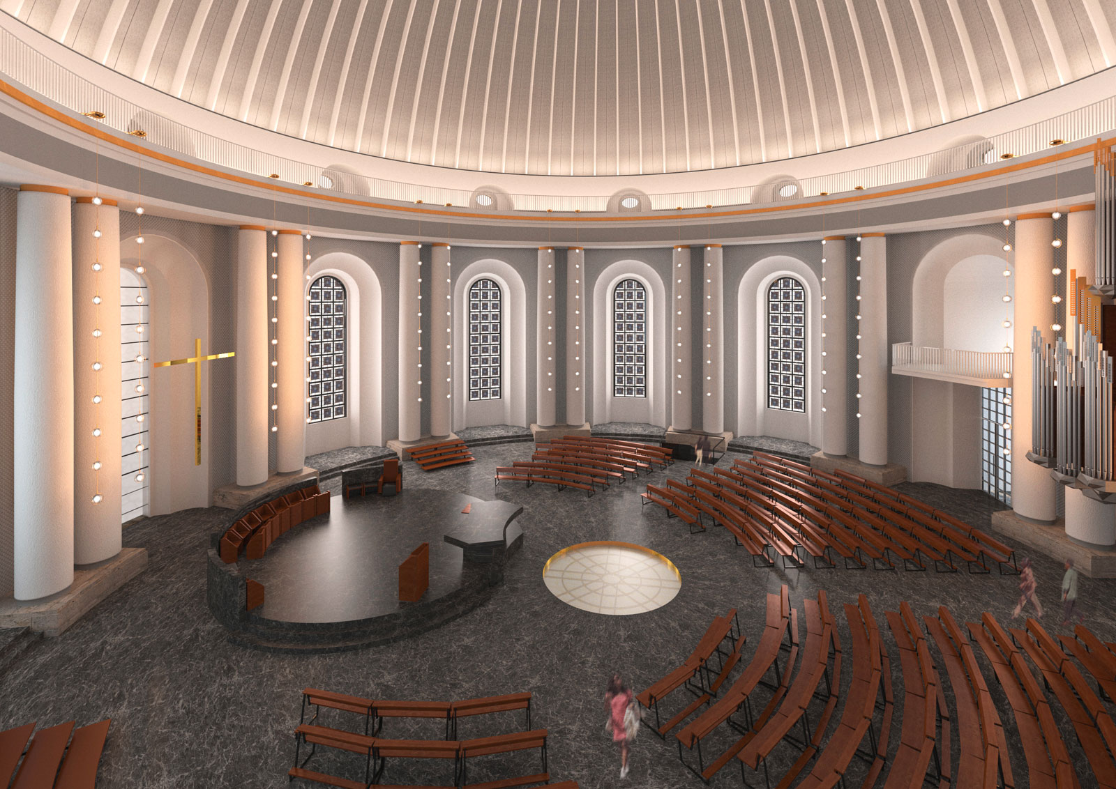Der Hauptraum der Kathedrale samt Farb- und Materialkonzept soll nach den Plänen von Hans Schwippert von 1963 weitgehend wiederhergestellt werden. Allerdings wird die Verbindung von Ober- und Unterkirche modifiziert: Die zentrale Treppe, die einen Großteil des Kirchenraums in Anspruch nimmt, soll zugunsten einer Glasöffnung entfernt werden. Dadurch muss die Gemeinde nicht mehr geteilt werden, die Verbindung der Ebenen bleibt aber trotzdem erhalten und das Licht kann ungehindert bis in die nun ruhigere Krypta leuchten. Zur Betonung beider Lichtöffnungen sollen deren Kanten vergoldet werden.