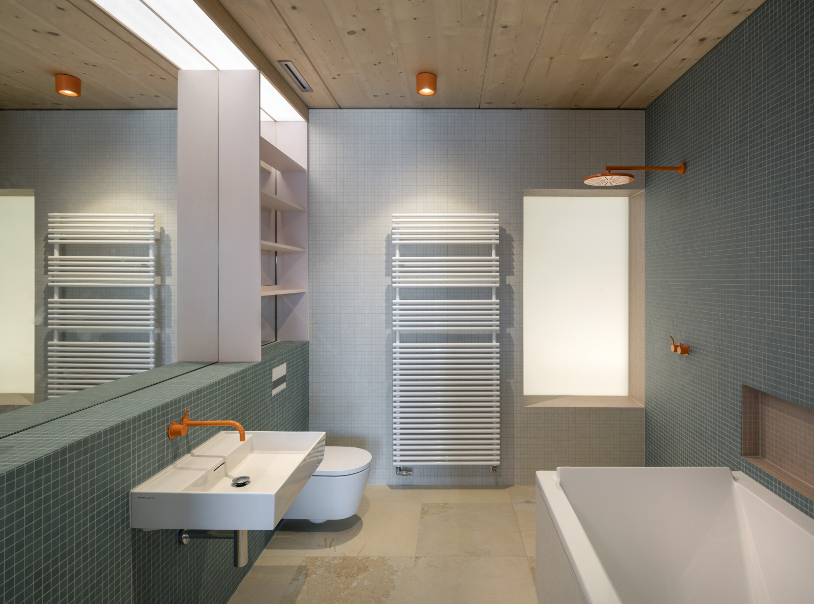 Unsere Idee war es die Küche als Mittelpunkt der Wohnung zu sehen. Als den Ort um den sich das Familienleben dreht, mit gemeinsamen kochen und an dem Freunde an einer Art Bar empfangen werden können. Sie liegt in der Achse zwischen den beiden vorhandenen Bäder. Dadurch kann der offene Raum zwischen den Bädern bestehen bleiben und das Licht von beiden Seiten die Wohnung weiterhin fluten. Das Ankommen wird durch die Panoramaaussicht und das Licht von beiden Seiten zum Erlebnis.