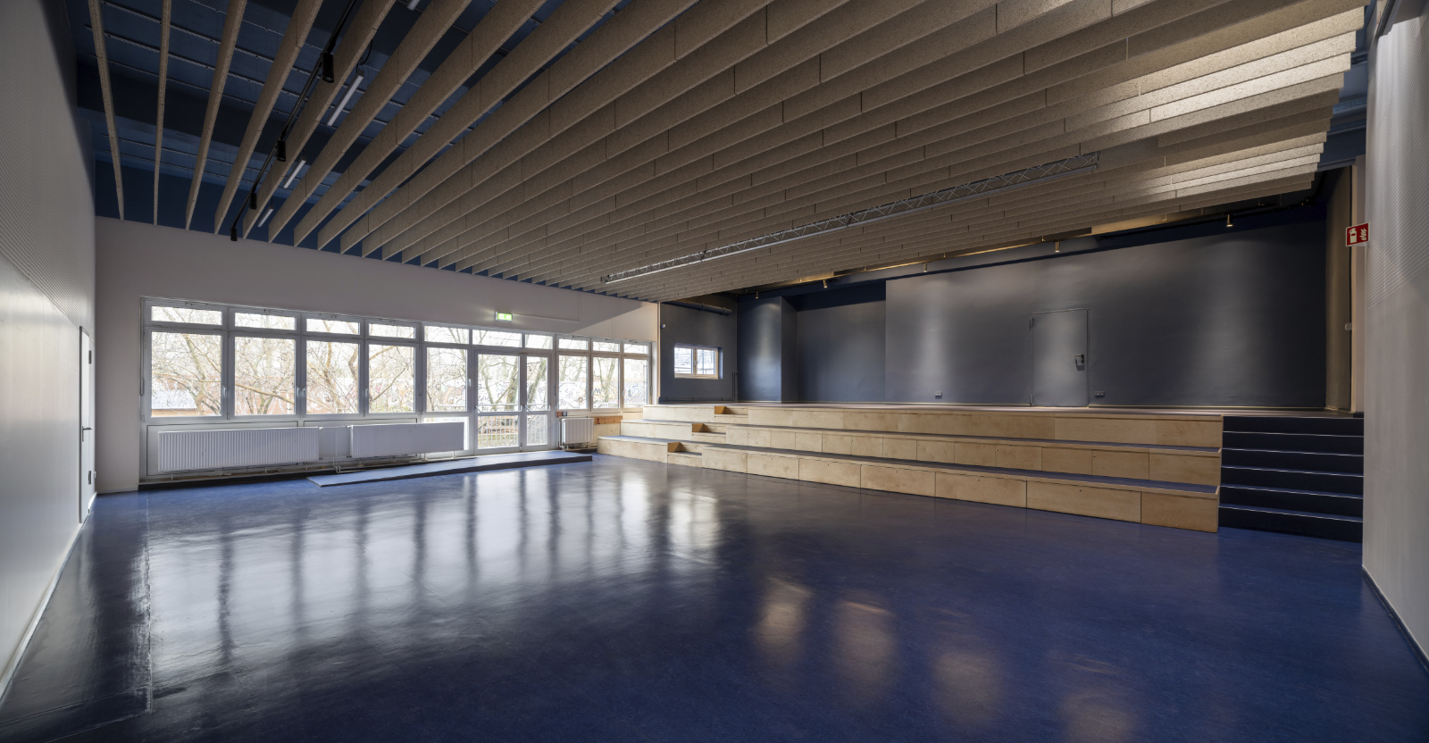 Ansicht Saal mit Blick auf die Bühne und akustische baffeldecke