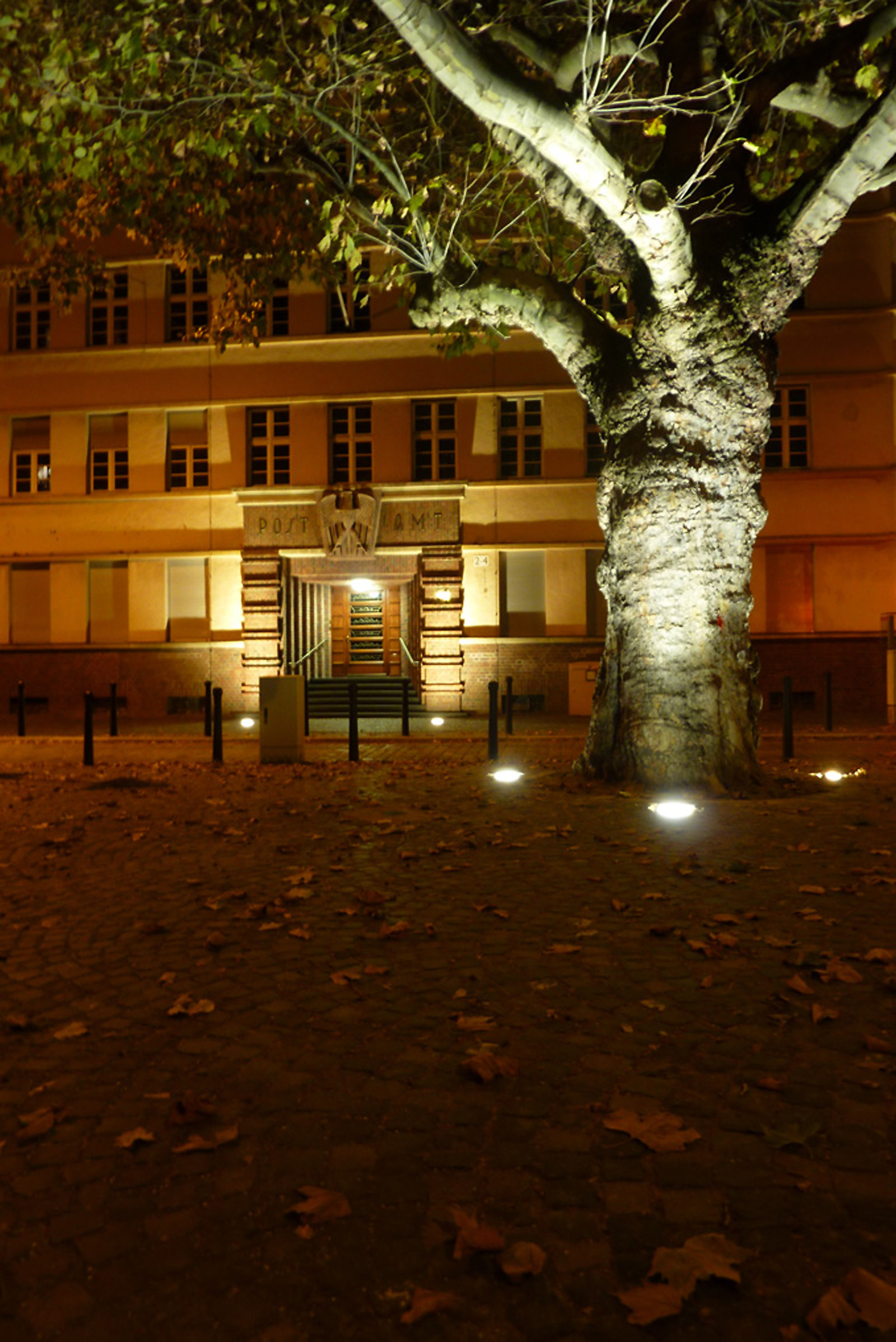 In einem langen, kooperativen Prozess mit den Bürgervertretungen und Behörden der Stadt Mannheim traten wir als Mittler auf. Die Firma war bereit, den Großteil der Kosten für den Umbau des öffentlichen Raums vor ihrer Haustür in einer Art Public-private-Partnership-Verfahren zu übernehmen. Kleine Eingriffe, wie das Ergänzen des historischen Kleinpflasters vor dem Postamt, Bodeneinbauleuchten für Haus und Baum, Bänke, Verlegung von Stellplätzen verändern den Stadtraum an dieser Stelle. Er gewinnt an Atmosphäre und Aufenthaltsqualität. Platz und Baudenkmal sind wieder richtig in Szene gesetzt.