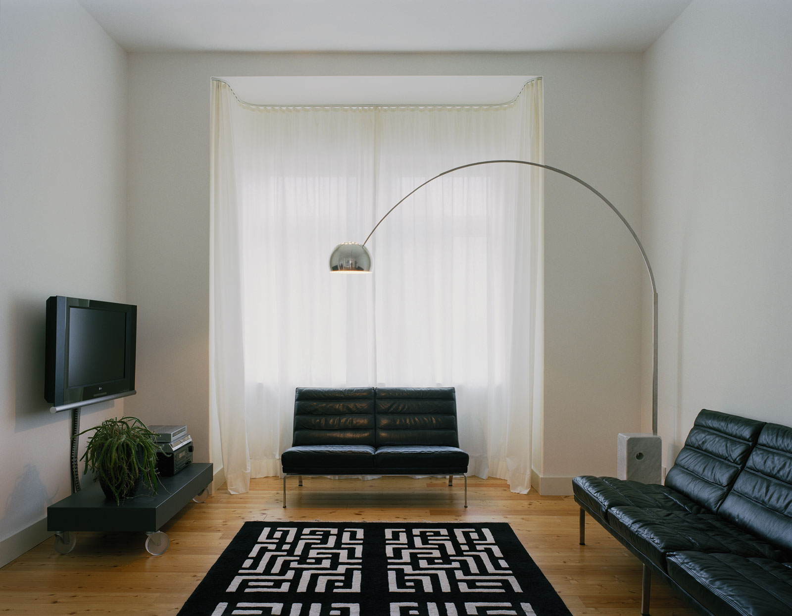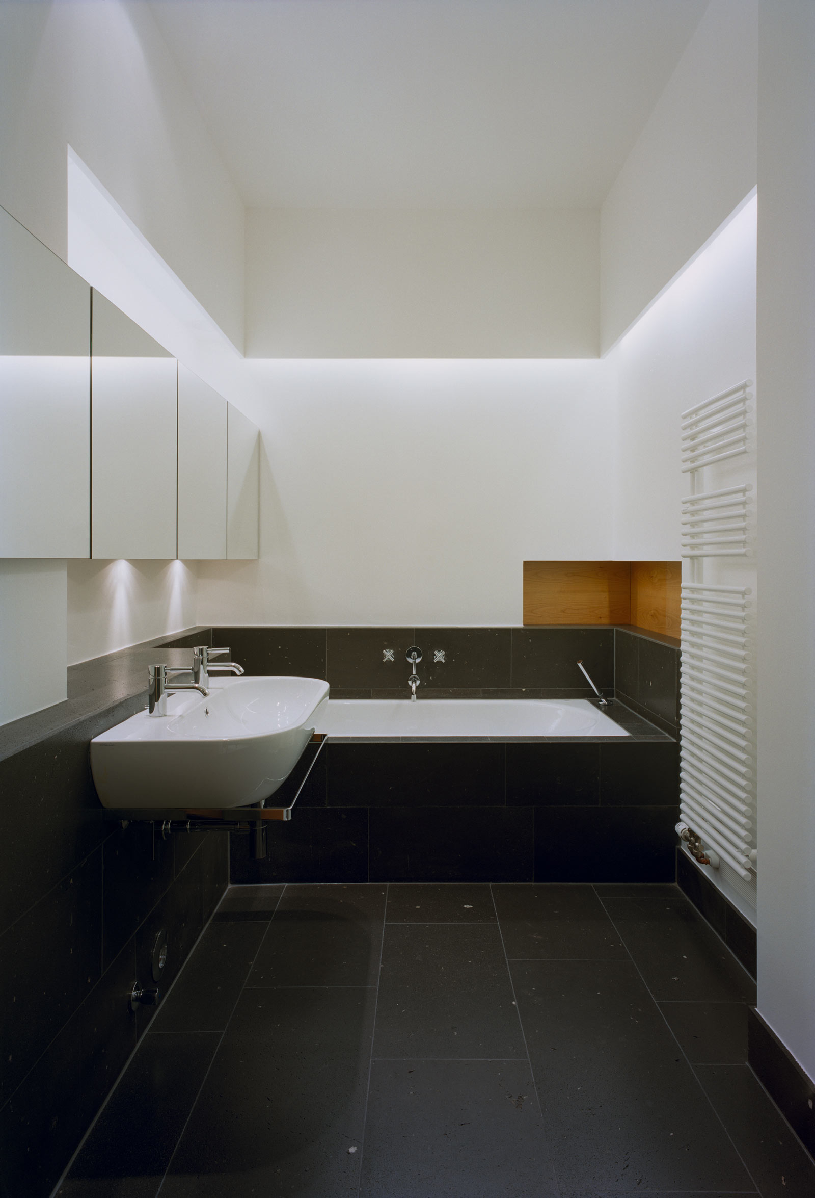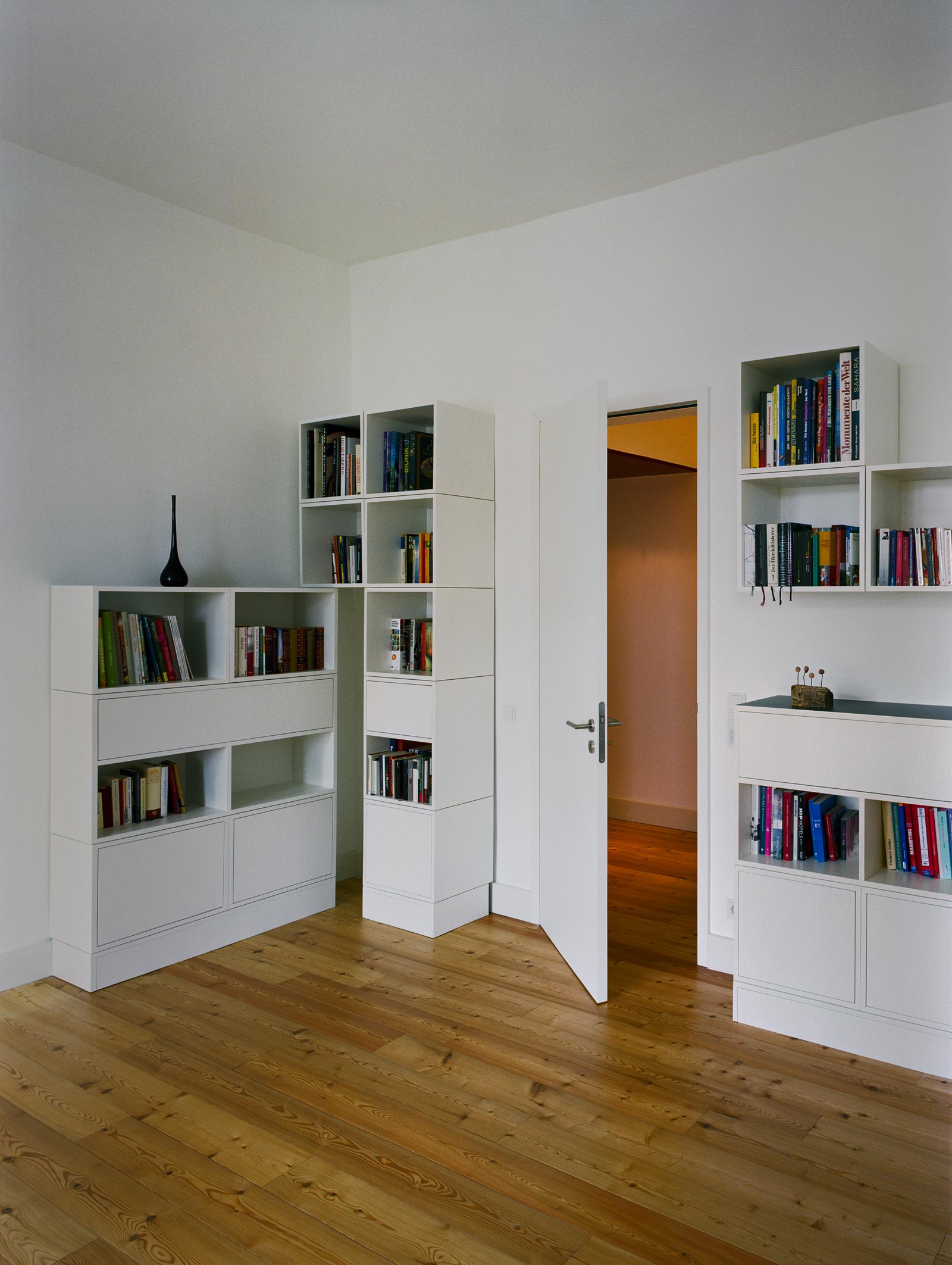 Dazu werden alle Türöffnungen auf 2,4m erhöht. Es wird eine neue schwellenlose durchgehende Lärchendielung verlegt. Das innen liegende Bad wird vergrößert und durch das Öffnen einer Ecke mit dem angrenzenden Berliner Zimmer verbunden. Die Räume werden mit wiederkehrenden Farben und Materialien (Basaltsteine im Bad und Gäste WC, helle Kirschholzeinbauten) gestalterisch verbunden. Durch textile Schiebeelemente, Wandmalerei und unterschiedliche Möglichkeiten der Lichtgestaltung werden individuelle Akzente gesetzt.