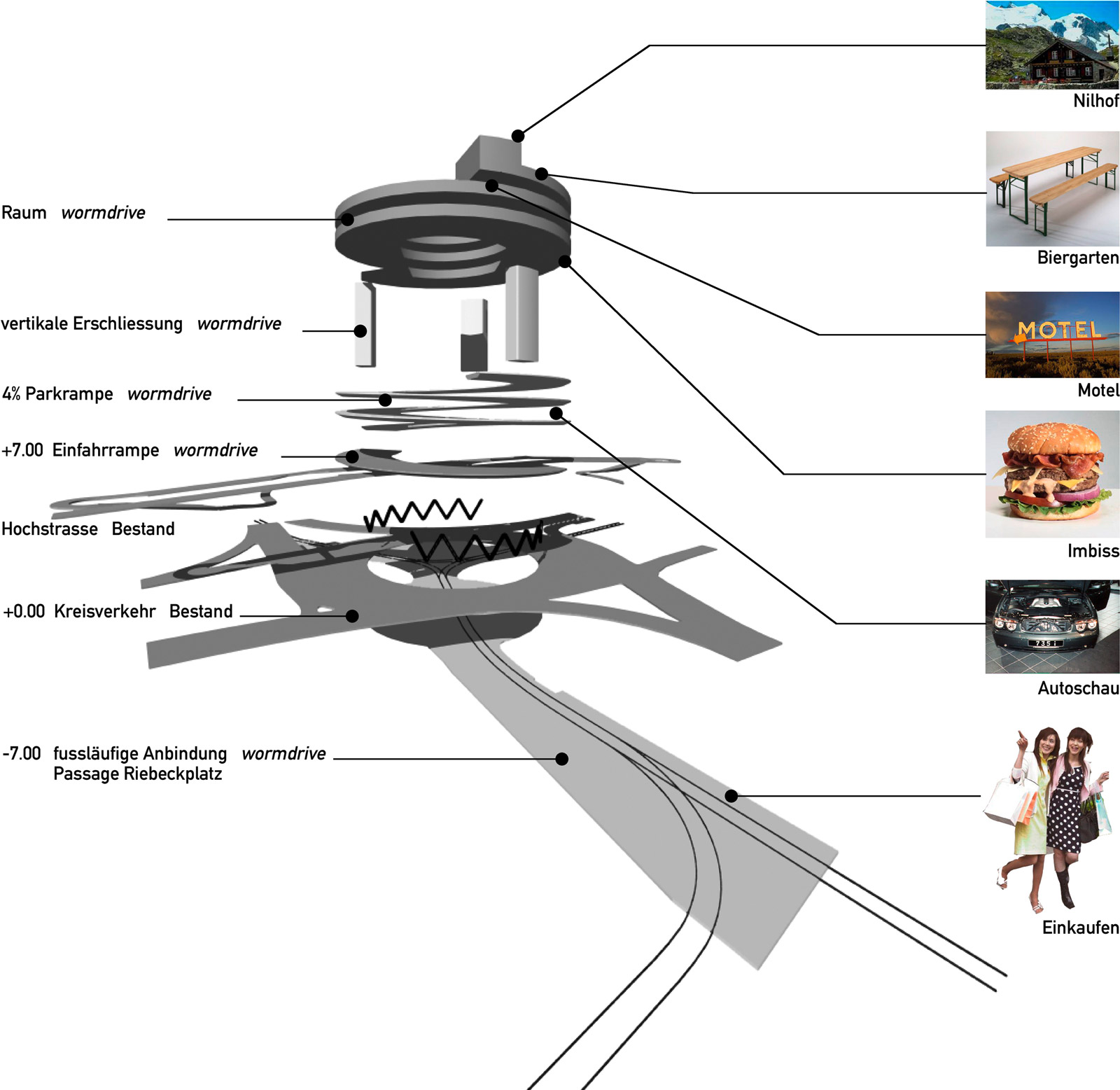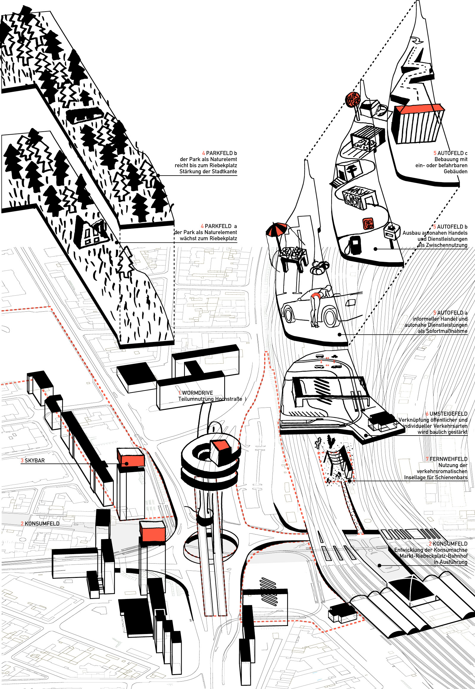 Um den „wormdrive“, eine bauliche Überhöhung des Kreisels, in dem Fahren, Gehen, Parken und Nutzflächen ineinander verschraubt werden, gruppieren sich die Elemente der neuen Landschaft: das Konsumfeld als Fortsetzung der Achse zwischen Marktplatz und Bahnhof, die Skybars auf den markanten Hochhäusern, die Weiterführung des Stadtparks, der sich mit Autonutzungen phasenweise entwickelnde Streifen entlang der Bahngleise und die direkt mit den Schienen verknüpften Orte des Umsteigefeldes und der Fernwehbar.