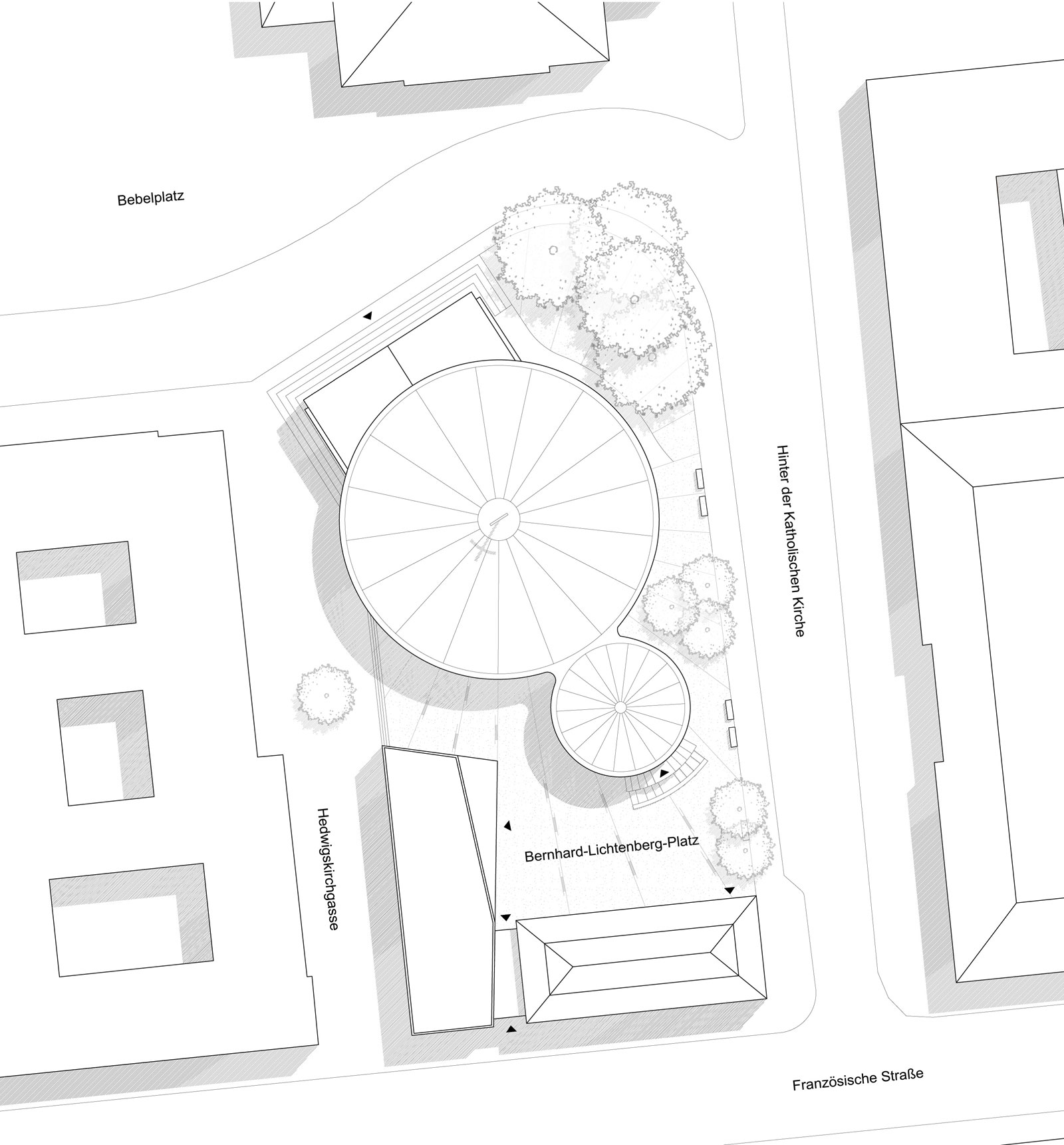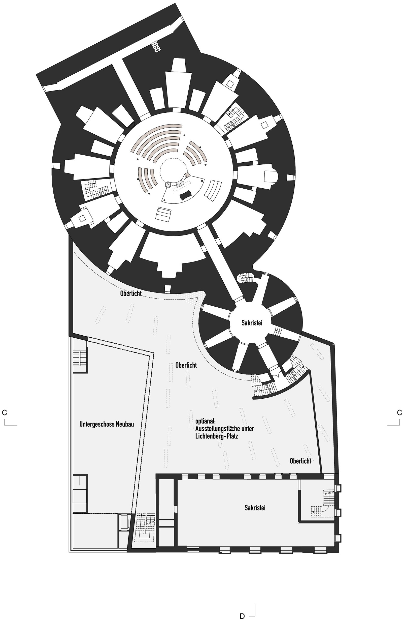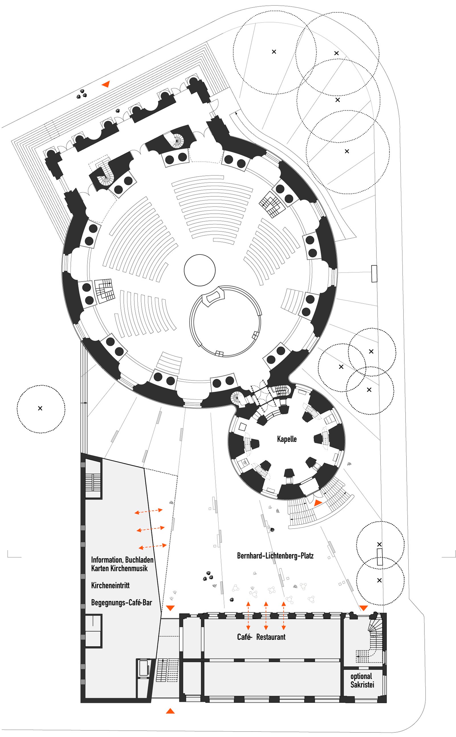Im Zentrum des Entwurfs steht die Schaffung eines lebendigen Kathedralplatzes zwischen Kirche und Bernhard-Lichtenberg-Haus, über den sich die Menschen ungezwungen sowohl kirchlichen als auch weltlichen Angeboten und Räumlichkeiten nähern können. Dabei hat die Offenheit und Flexibilität der neu geschaffenen Räume einen hohen Stellenwert.