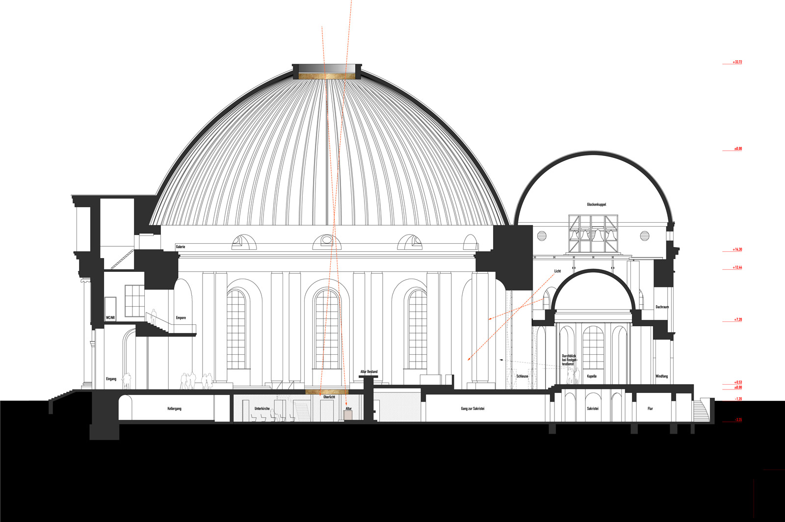 Ein wichtiges Element zur Öffnung der Kirche stellt die Umnutzung der Sakristei zur Kapelle dar – ein Ort der Stille im Trubel der Großstadt. Die sowohl von innen als auch außen zugängliche Andachtsstätte birgt für alle Menschen die Möglichkeit, zur Ruhe zu kommen, ohne ins Kircheninnere vordringen zu müssen.