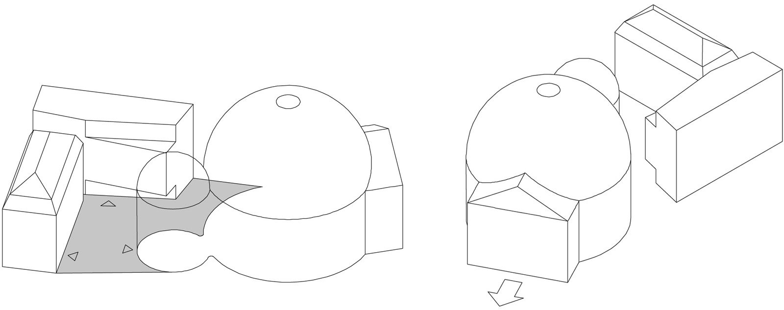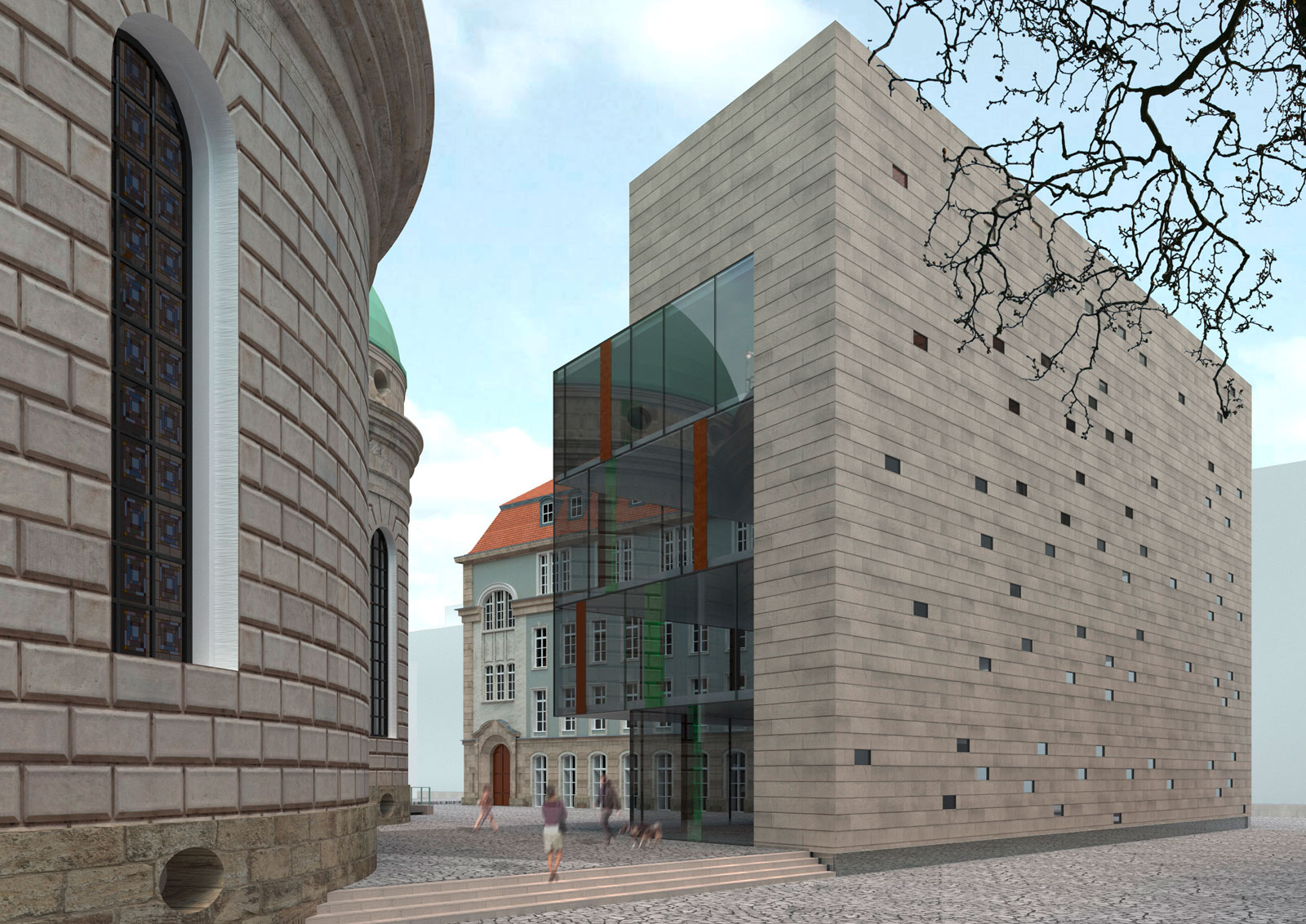 Das Bernhard-Lichtenberg-Haus soll weiterhin als Gemeindehaus dienen, sein Angebot aber noch durch Gastronomie, Veranstaltungsflächen und Wohnen erweitert werden. Da der Altbau eine hohe bauliche Qualität aufweist, soll dieser erhalten werden. Der 70er-Jahre-Baukörper hingegen soll durch einen einladenderen Neubau ersetzt werden. Dieser erhält einen massiven Rücken aus demselben hellen Sandstein wie auch die Kirche und der Altbau. Zum Platz hin öffnet sich der Baukörper durch eine Glasfassade. Zwischen Alt- und Neubau vermittelt eine verglaste Fuge, die das gemeinsame Treppenhaus beherbergt.