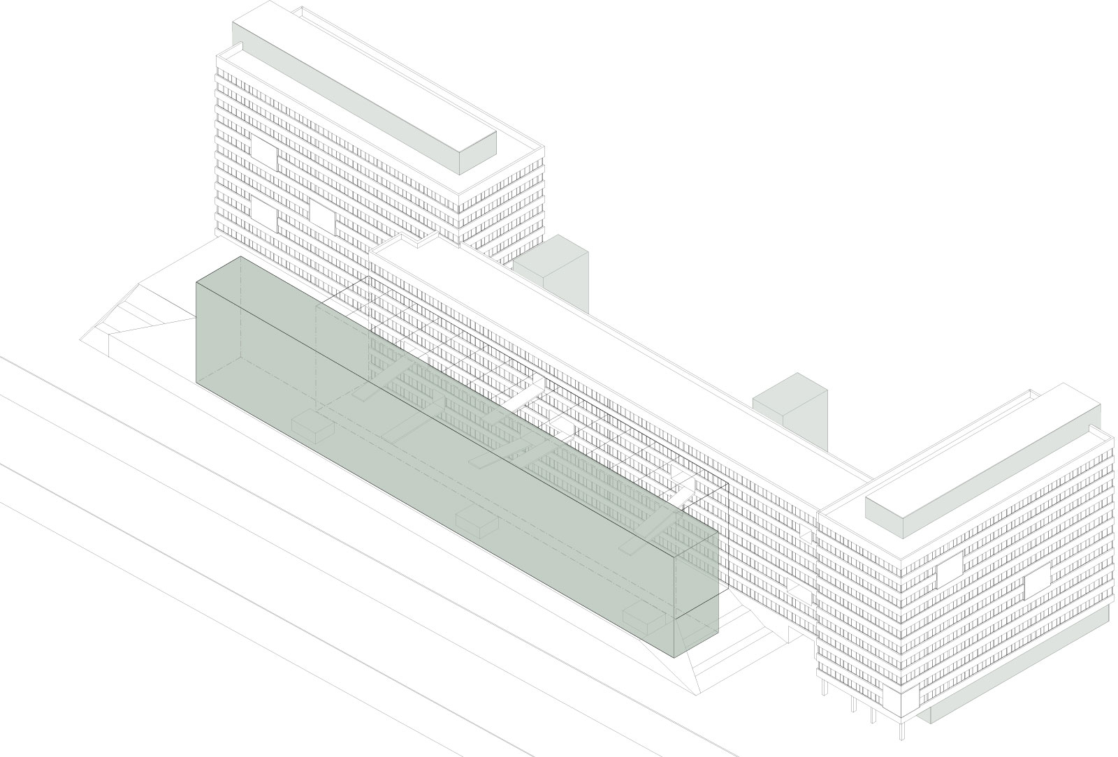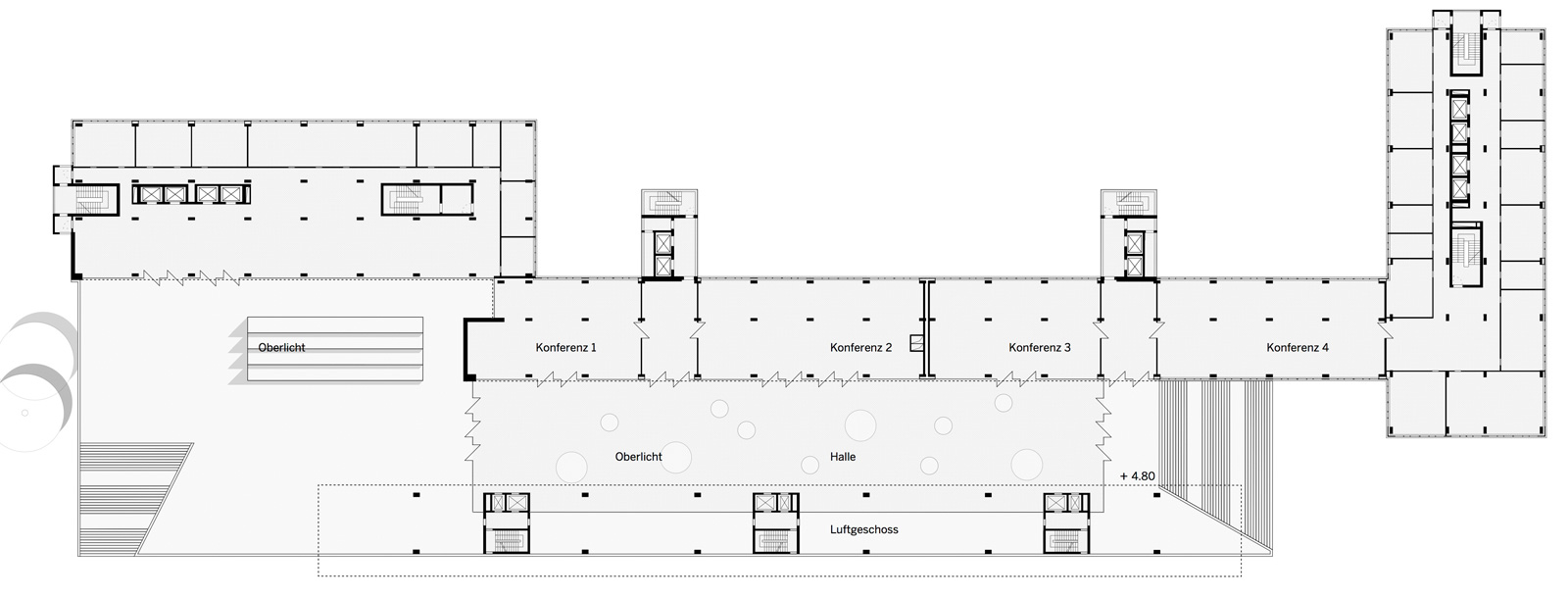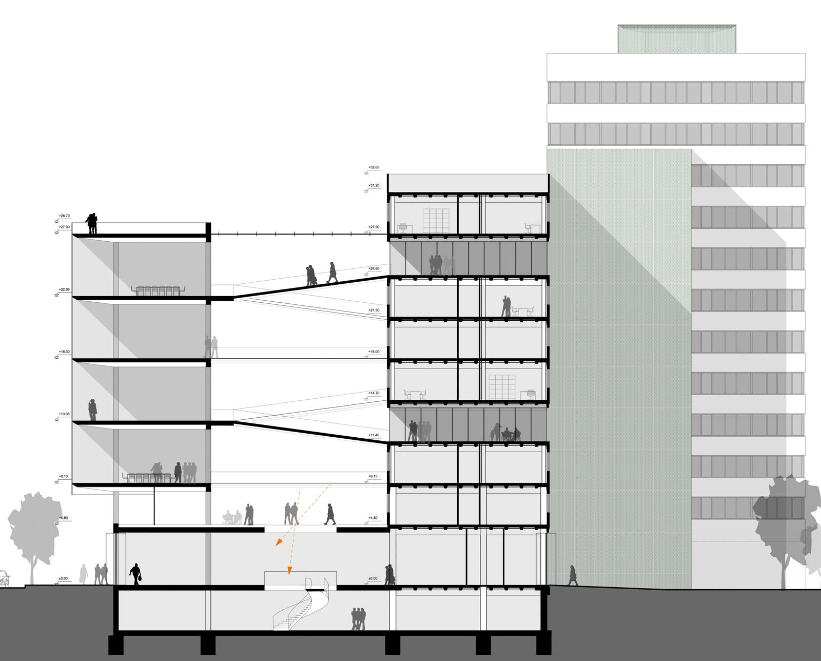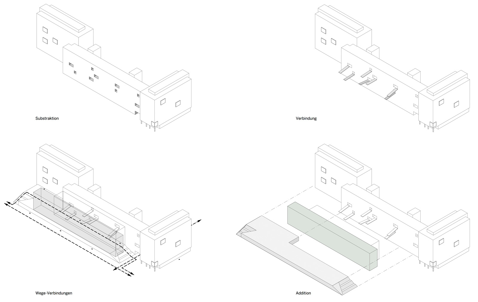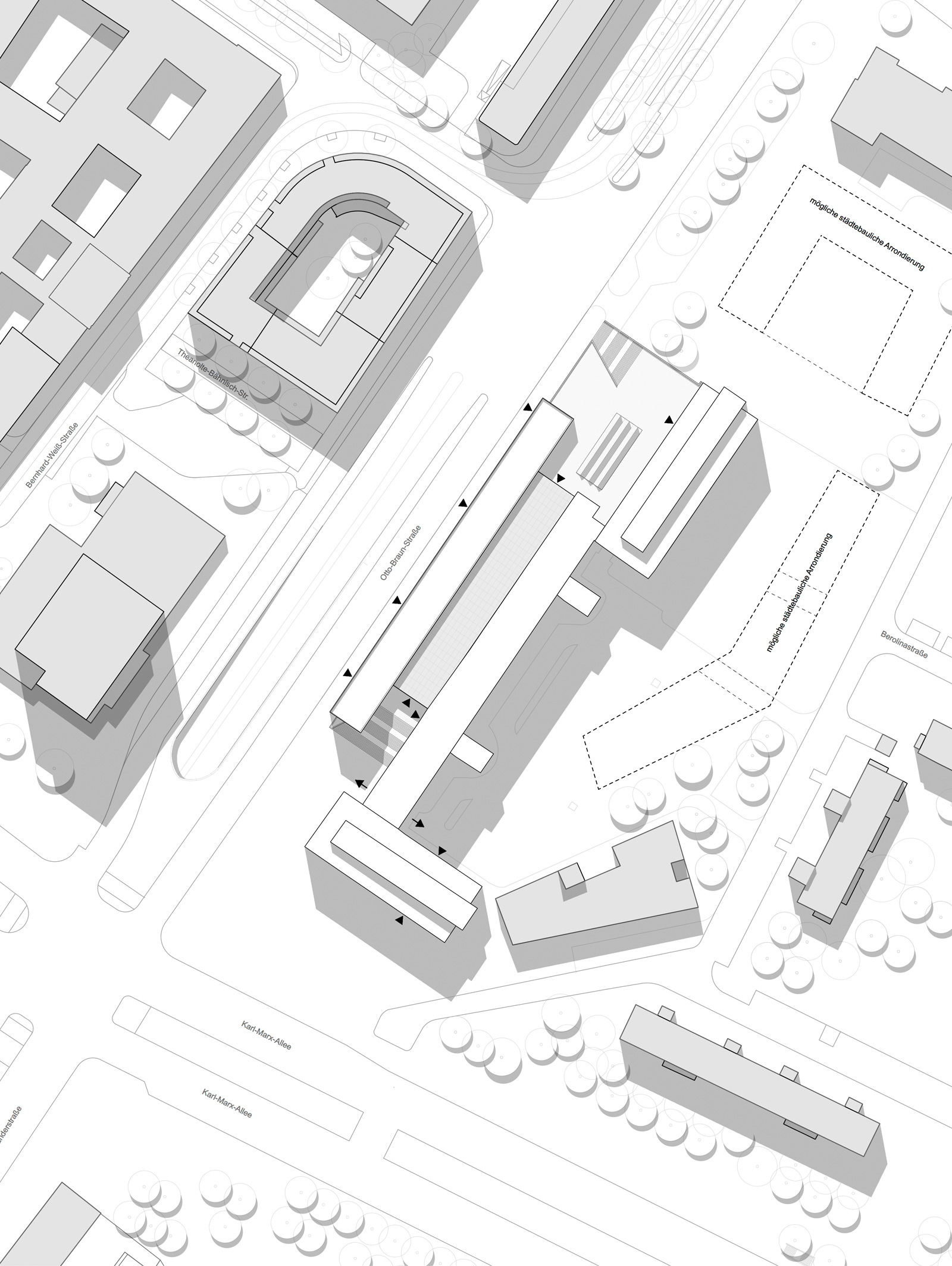 Das bestehende Ensemble des ehemaligen Haus der Statistik ist ein markantes Bauwerk am Berliner Alexanderplatz. Die charakteristischen, streifenförmigen Bandfassaden überziehen konsequent alle Bauteile. Dieses Grundthema des Erscheinungsbildes wird im vorgelegten Entwurf respektiert und beibehalten. Die räumlichen und technischen Probleme des Gebäudes werden schrittweise gelöst: Umbau des Bestands, Fassadensanierung und ergänzende Bauten.