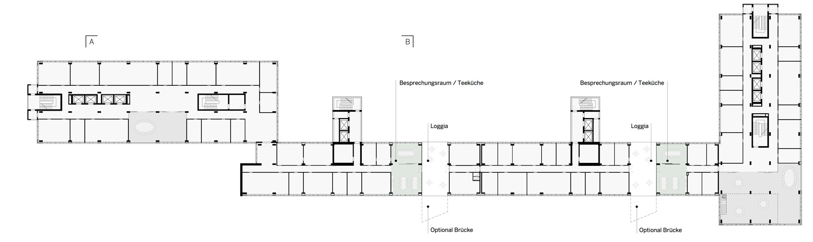 Die Idee „Bandfassade“ wird durch eingeschnittene Loggien und Lufträume ergänzt und um neue Bauteile erweitert.